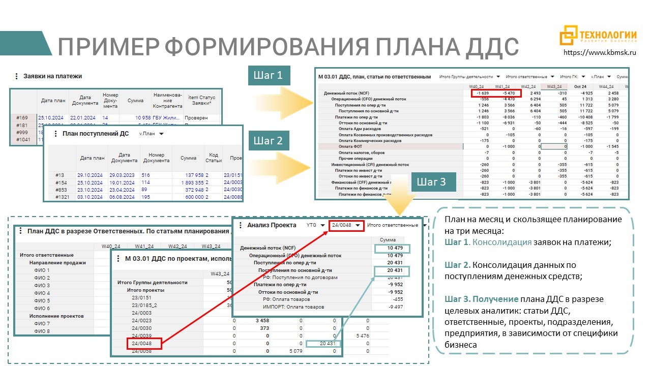 Сервис БА-03 включает: ежедневный мониторинг факта и прогноза ДДС (в разрезах договоров, ответственных, проектов), отчетность, управление платежным календарем и план- факт контроль, использование функций CPM / BI Corplan.